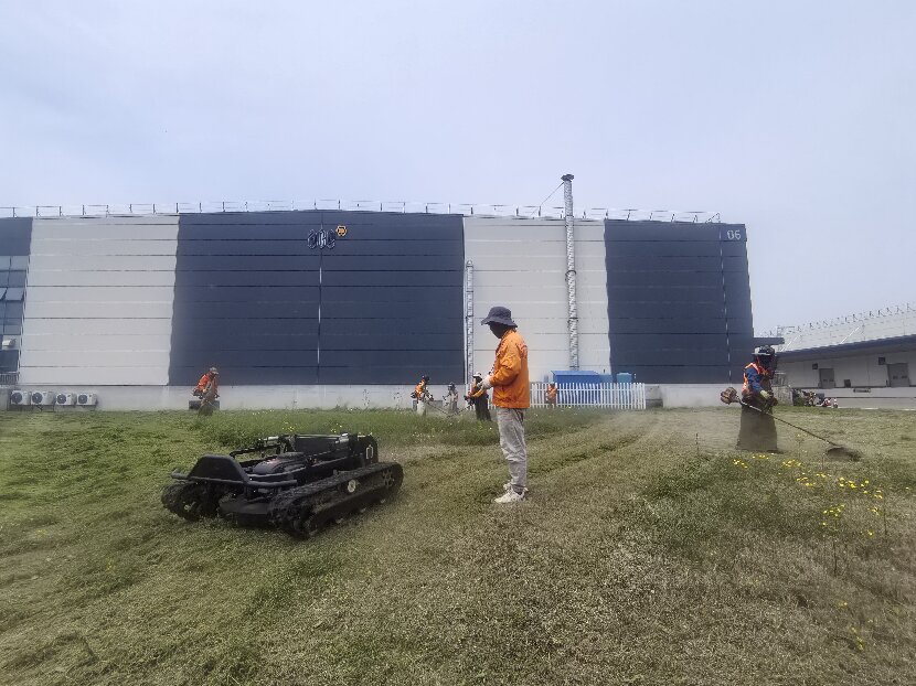 為實現“又快又好”的清理效果,突擊隊創新采用人工精細整治與遙控割草機智能作業相結合的方式,快慢互補、點面兼顧。遙控割草機高效推進大面積草坪修剪,黨員與生產骨干手持工具,對邊角、綠化帶、活動路線沿線等機械難以覆蓋區域進行精細化清理,徹底清除雜草、枯枝、碎石及各類衛生雜物,確保草坪平整美觀、路線干凈整潔。